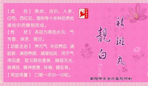 靓白祛斑丸是依托医圣故里南阳历史悠久的中医文化,由我院多名老中医历经多年研制而成。使用熟地、当归、人参、白芍、西红花、香附等十余种名贵地道纯中药精制而成,药材大多采自中原药材原产地。纯天然地道中药,内服补血、活血行气为原则调理气血,使气血通畅、容颜焕发。